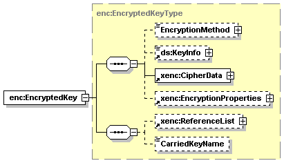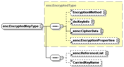 | source | <xsd:complexType name="EncryptedKeyType"> <xsd:complexContent> <xsd:extension base="xenc:EncryptedType"> <xsd:sequence> <xsd:element ref="xenc:ReferenceList" minOccurs="0"/> <xsd:element name="CarriedKeyName" type="string" minOccurs="0"/> </xsd:sequence> <xsd:attribute name="Recipient" type="string" use="optional"/> </xsd:extension> </xsd:complexContent> </xsd:complexType> |