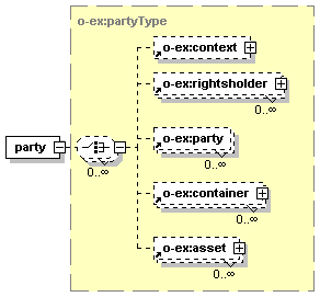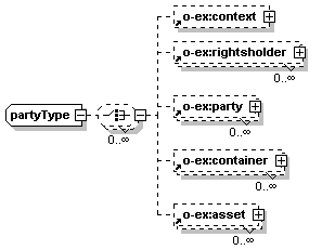 | source | <xsd:complexType name="partyType"> <xsd:choice minOccurs="0" maxOccurs="unbounded"> <xsd:element ref="o-ex:context" minOccurs="0"/> <xsd:element ref="o-ex:rightsholder" minOccurs="0" maxOccurs="unbounded"/> <xsd:element ref="o-ex:party" minOccurs="0" maxOccurs="unbounded"/> <xsd:element ref="o-ex:container" minOccurs="0" maxOccurs="unbounded"/> <xsd:element ref="o-ex:asset" minOccurs="0" maxOccurs="unbounded"/> </xsd:choice> <xsd:attributeGroup ref="o-ex:IDGroup"/> </xsd:complexType> |