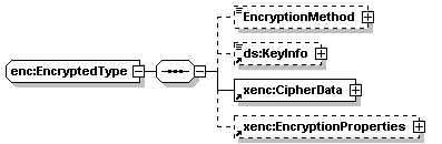 | source | <xsd:complexType name="EncryptedType" abstract="true"> <xsd:sequence> <xsd:element name="EncryptionMethod" type="xenc:EncryptionMethodType" minOccurs="0"/> <xsd:element ref="ds:KeyInfo" minOccurs="0"/> <xsd:element ref="xenc:CipherData"/> <xsd:element ref="xenc:EncryptionProperties" minOccurs="0"/> </xsd:sequence> <xsd:attribute name="Id" type="ID" use="optional"/> <xsd:attribute name="Type" type="anyURI" use="optional"/> <xsd:attribute name="MimeType" type="string" use="optional"/> <xsd:attribute name="Encoding" type="anyURI" use="optional"/> </xsd:complexType> |