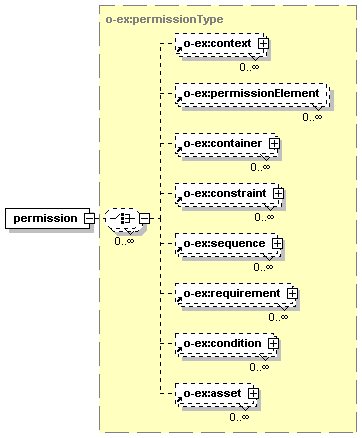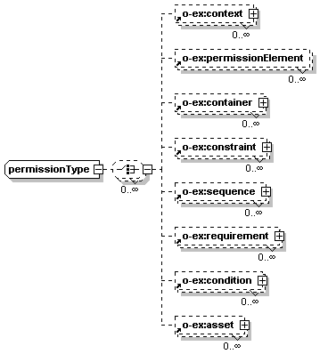 | source | <xsd:complexType name="permissionType"> <xsd:choice minOccurs="0" maxOccurs="unbounded"> <xsd:element ref="o-ex:context" minOccurs="0" maxOccurs="unbounded"/> <xsd:element ref="o-ex:permissionElement" minOccurs="0" maxOccurs="unbounded"/> <xsd:element ref="o-ex:container" minOccurs="0" maxOccurs="unbounded"/> <xsd:element ref="o-ex:constraint" minOccurs="0" maxOccurs="unbounded"/> <xsd:element ref="o-ex:sequence" minOccurs="0" maxOccurs="unbounded"/> <xsd:element ref="o-ex:requirement" minOccurs="0" maxOccurs="unbounded"/> <xsd:element ref="o-ex:condition" minOccurs="0" maxOccurs="unbounded"/> <xsd:element ref="o-ex:asset" minOccurs="0" maxOccurs="unbounded"/> </xsd:choice> <xsd:attribute name="exclusive" type="xsd:boolean" use="optional"/> <xsd:attributeGroup ref="o-ex:IDGroup"/> </xsd:complexType> |