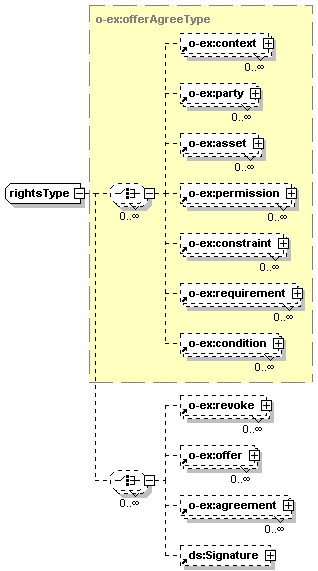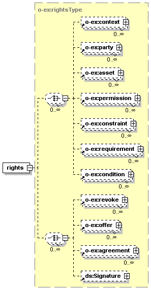 | source | <xsd:complexType name="rightsType"> <xsd:complexContent> <xsd:extension base="o-ex:offerAgreeType"> <xsd:choice minOccurs="0" maxOccurs="unbounded"> <xsd:element ref="o-ex:revoke" minOccurs="0" maxOccurs="unbounded"/> <xsd:element ref="o-ex:offer" minOccurs="0" maxOccurs="unbounded"/> <xsd:element ref="o-ex:agreement" minOccurs="0" maxOccurs="unbounded"/> <xsd:element ref="ds:Signature" minOccurs="0"/> </xsd:choice> <xsd:attributeGroup ref="o-ex:IDGroup"/> </xsd:extension> </xsd:complexContent> </xsd:complexType> |