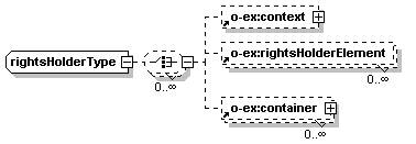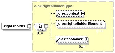 | source | <xsd:complexType name="rightsHolderType"> <xsd:choice minOccurs="0" maxOccurs="unbounded"> <xsd:element ref="o-ex:context" minOccurs="0"/> <xsd:element ref="o-ex:rightsHolderElement" minOccurs="0" maxOccurs="unbounded"/> <xsd:element ref="o-ex:container" minOccurs="0" maxOccurs="unbounded"/> </xsd:choice> <xsd:attributeGroup ref="o-ex:IDGroup"/> </xsd:complexType> |