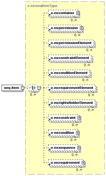 | source | <xsd:complexType name="seqItemType"> <xsd:choice minOccurs="0" maxOccurs="unbounded"> <xsd:element ref="o-ex:container" minOccurs="0" maxOccurs="unbounded"/> <xsd:element ref="o-ex:permission" minOccurs="0" maxOccurs="unbounded"/> <xsd:element ref="o-ex:permissionElement" minOccurs="0" maxOccurs="unbounded"/> <xsd:element ref="o-ex:constraintElement" minOccurs="0" maxOccurs="unbounded"/> <xsd:element ref="o-ex:conditionElement" minOccurs="0" maxOccurs="unbounded"/> <xsd:element ref="o-ex:requirementElement" minOccurs="0" maxOccurs="unbounded"/> <xsd:element ref="o-ex:rightsHolderElement" minOccurs="0" maxOccurs="unbounded"/> <xsd:element ref="o-ex:constraint" minOccurs="0" maxOccurs="unbounded"/> <xsd:element ref="o-ex:condition" minOccurs="0" maxOccurs="unbounded"/> <xsd:element ref="o-ex:sequence" minOccurs="0" maxOccurs="unbounded"/> <xsd:element ref="o-ex:requirement" minOccurs="0" maxOccurs="unbounded"/> </xsd:choice> <xsd:attribute name="number" type="xsd:integer" use="required"/> </xsd:complexType> |