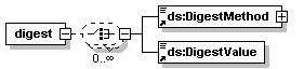 | source | <xsd:element name="digest"> <xsd:complexType> <xsd:choice minOccurs="0" maxOccurs="unbounded"> <xsd:element ref="ds:DigestMethod"/> <xsd:element ref="ds:DigestValue"/> </xsd:choice> </xsd:complexType> </xsd:element> |