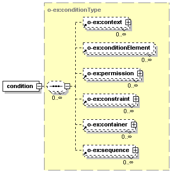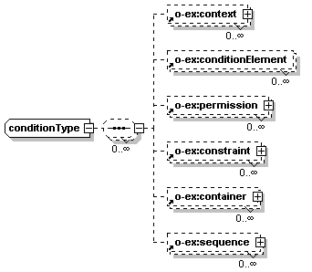 | source | <xsd:complexType name="conditionType"> <xsd:sequence minOccurs="0" maxOccurs="unbounded"> <xsd:element ref="o-ex:context" minOccurs="0" maxOccurs="unbounded"/> <xsd:element ref="o-ex:conditionElement" minOccurs="0" maxOccurs="unbounded"/> <xsd:element ref="o-ex:permission" minOccurs="0" maxOccurs="unbounded"/> <xsd:element ref="o-ex:constraint" minOccurs="0" maxOccurs="unbounded"/> <xsd:element ref="o-ex:container" minOccurs="0" maxOccurs="unbounded"/> <xsd:element ref="o-ex:sequence" minOccurs="0" maxOccurs="unbounded"/> </xsd:sequence> <xsd:attributeGroup ref="o-ex:IDGroup"/> </xsd:complexType> |