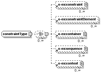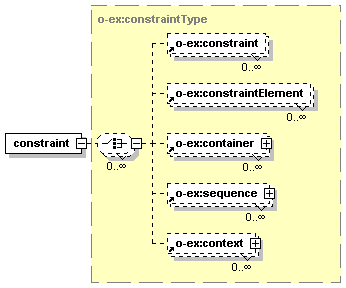 | source | <xsd:complexType name="constraintType"> <xsd:choice minOccurs="0" maxOccurs="unbounded"> <xsd:element ref="o-ex:constraint" minOccurs="0" maxOccurs="unbounded"/> <xsd:element ref="o-ex:constraintElement" minOccurs="0" maxOccurs="unbounded"/> <xsd:element ref="o-ex:container" minOccurs="0" maxOccurs="unbounded"/> <xsd:element ref="o-ex:sequence" minOccurs="0" maxOccurs="unbounded"/> <xsd:element ref="o-ex:context" minOccurs="0" maxOccurs="unbounded"/> </xsd:choice> <xsd:attributeGroup ref="o-ex:IDGroup"/> <xsd:attribute name="type" type="xsd:anyURI"/> </xsd:complexType> |