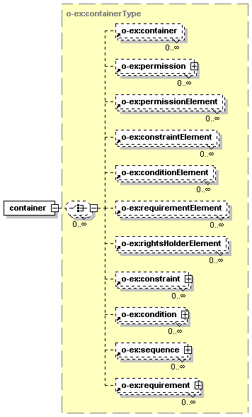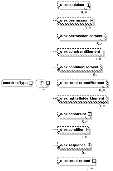 | source | <xsd:complexType name="containerType"> <xsd:choice minOccurs="0" maxOccurs="unbounded"> <xsd:element ref="o-ex:container" minOccurs="0" maxOccurs="unbounded"/> <xsd:element ref="o-ex:permission" minOccurs="0" maxOccurs="unbounded"/> <xsd:element ref="o-ex:permissionElement" minOccurs="0" maxOccurs="unbounded"/> <xsd:element ref="o-ex:constraintElement" minOccurs="0" maxOccurs="unbounded"/> <xsd:element ref="o-ex:conditionElement" minOccurs="0" maxOccurs="unbounded"/> <xsd:element ref="o-ex:requirementElement" minOccurs="0" maxOccurs="unbounded"/> <xsd:element ref="o-ex:rightsHolderElement" minOccurs="0" maxOccurs="unbounded"/> <xsd:element ref="o-ex:constraint" minOccurs="0" maxOccurs="unbounded"/> <xsd:element ref="o-ex:condition" minOccurs="0" maxOccurs="unbounded"/> <xsd:element ref="o-ex:sequence" minOccurs="0" maxOccurs="unbounded"/> <xsd:element ref="o-ex:requirement" minOccurs="0" maxOccurs="unbounded"/> </xsd:choice> <xsd:attribute name="type" default="and"> <xsd:simpleType> <xsd:restriction base="xsd:NMTOKEN"> <xsd:enumeration value="and"/> <xsd:enumeration value="in-or"/> <xsd:enumeration value="ex-or"/> </xsd:restriction> </xsd:simpleType> </xsd:attribute> <xsd:attributeGroup ref="o-ex:IDGroup"/> </xsd:complexType> |