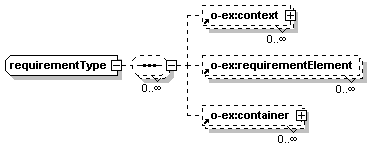 | source | <xsd:complexType name="requirementType"> <xsd:sequence minOccurs="0" maxOccurs="unbounded"> <xsd:element ref="o-ex:context" minOccurs="0" maxOccurs="unbounded"/> <xsd:element ref="o-ex:requirementElement" minOccurs="0" maxOccurs="unbounded"/> <xsd:element ref="o-ex:container" minOccurs="0" maxOccurs="unbounded"/> </xsd:sequence> <xsd:attributeGroup ref="o-ex:IDGroup"/> </xsd:complexType> |
