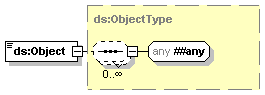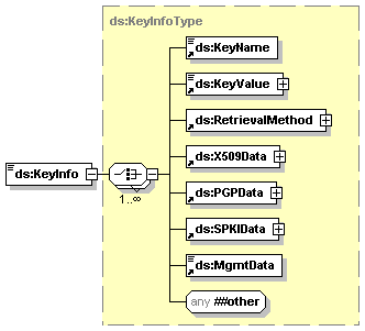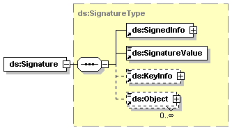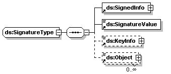 | source | <xsd:complexType name="SignatureType"> <xsd:sequence> <xsd:element ref="ds:SignedInfo"/> <xsd:element ref="ds:SignatureValue"/> <xsd:element ref="ds:KeyInfo" minOccurs="0"/> <xsd:element ref="ds:Object" minOccurs="0" maxOccurs="unbounded"/> </xsd:sequence> <xsd:attribute name="Id" type="ID" use="optional"/> </xsd:complexType> |