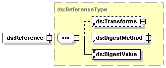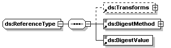 | source | <xsd:complexType name="ReferenceType"> <xsd:sequence> <xsd:element ref="ds:Transforms" minOccurs="0"/> <xsd:element ref="ds:DigestMethod"/> <xsd:element ref="ds:DigestValue"/> </xsd:sequence> <xsd:attribute name="Id" type="ID" use="optional"/> <xsd:attribute name="URI" type="anyURI" use="optional"/> <xsd:attribute name="Type" type="anyURI" use="optional"/> </xsd:complexType> |