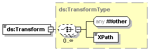| source | <xsd:complexType name="TransformType" mixed="true"> <xsd:choice minOccurs="0" maxOccurs="unbounded"> <xsd:any namespace="##other" processContents="lax"/> <xsd:element name="XPath" type="string"/> </xsd:choice> <xsd:attribute name="Algorithm" type="anyURI" use="required"/> </xsd:complexType> |