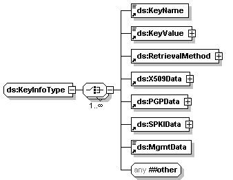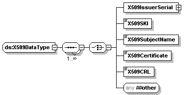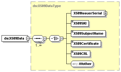 | source | <xsd:complexType name="X509DataType"> <xsd:sequence maxOccurs="unbounded"> <xsd:choice> <xsd:element name="X509IssuerSerial" type="ds:X509IssuerSerialType"/> <xsd:element name="X509SKI" type="base64Binary"/> <xsd:element name="X509SubjectName" type="string"/> <xsd:element name="X509Certificate" type="base64Binary"/> <xsd:element name="X509CRL" type="base64Binary"/> <xsd:any namespace="##other" processContents="lax"/> </xsd:choice> </xsd:sequence> </xsd:complexType> |
