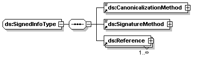 | source | <xsd:complexType name="SignedInfoType"> <xsd:sequence> <xsd:element ref="ds:CanonicalizationMethod"/> <xsd:element ref="ds:SignatureMethod"/> <xsd:element ref="ds:Reference" maxOccurs="unbounded"/> </xsd:sequence> <xsd:attribute name="Id" type="ID" use="optional"/> </xsd:complexType> |