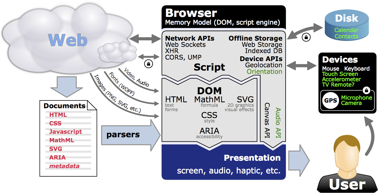 | Device access | Web APIs: Geolocation, Multi-touch, Media Capture, etc. |