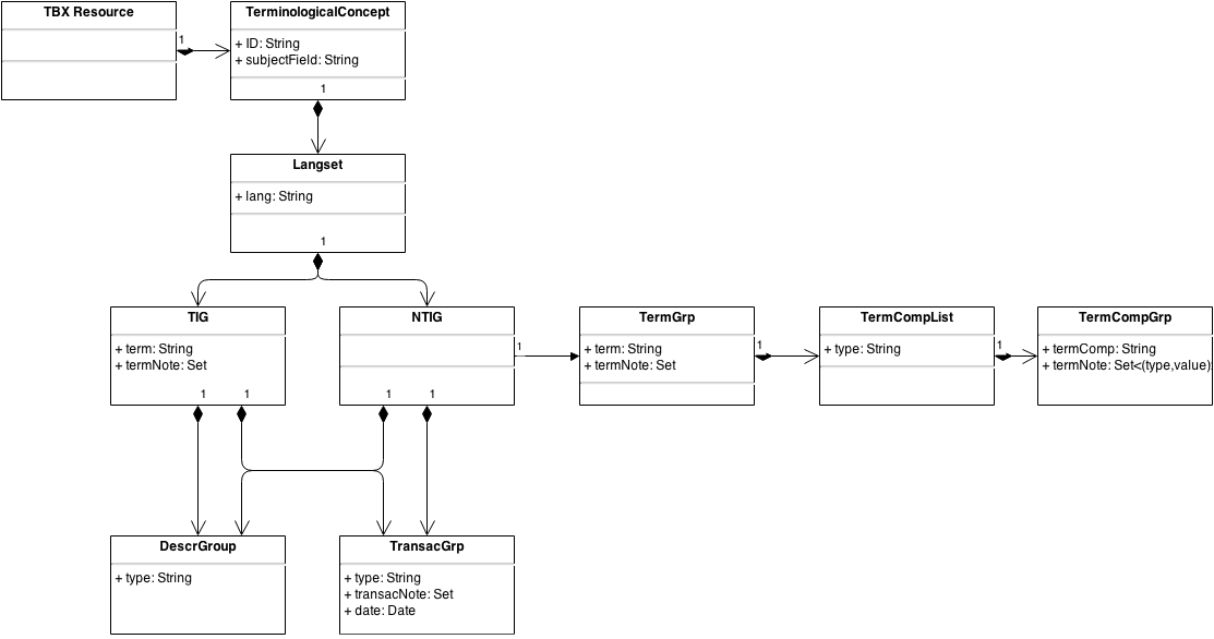 The following list provides an overview of the main elements of a multilingual terminology represented in TBX format.