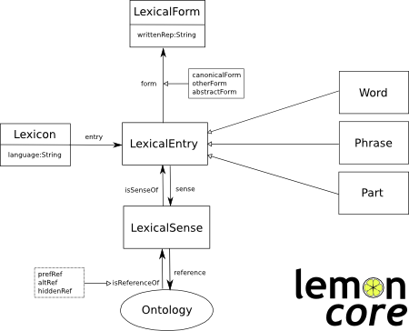 In that context lemon (Lexicon Model for Ontologies) was proposed to provide a de facto standard to be used by a cloud of lexical linked data resources such as WordNet, BabelNet, and UBY, among many others. The lemon model’s core consists of the following elements depicted below: