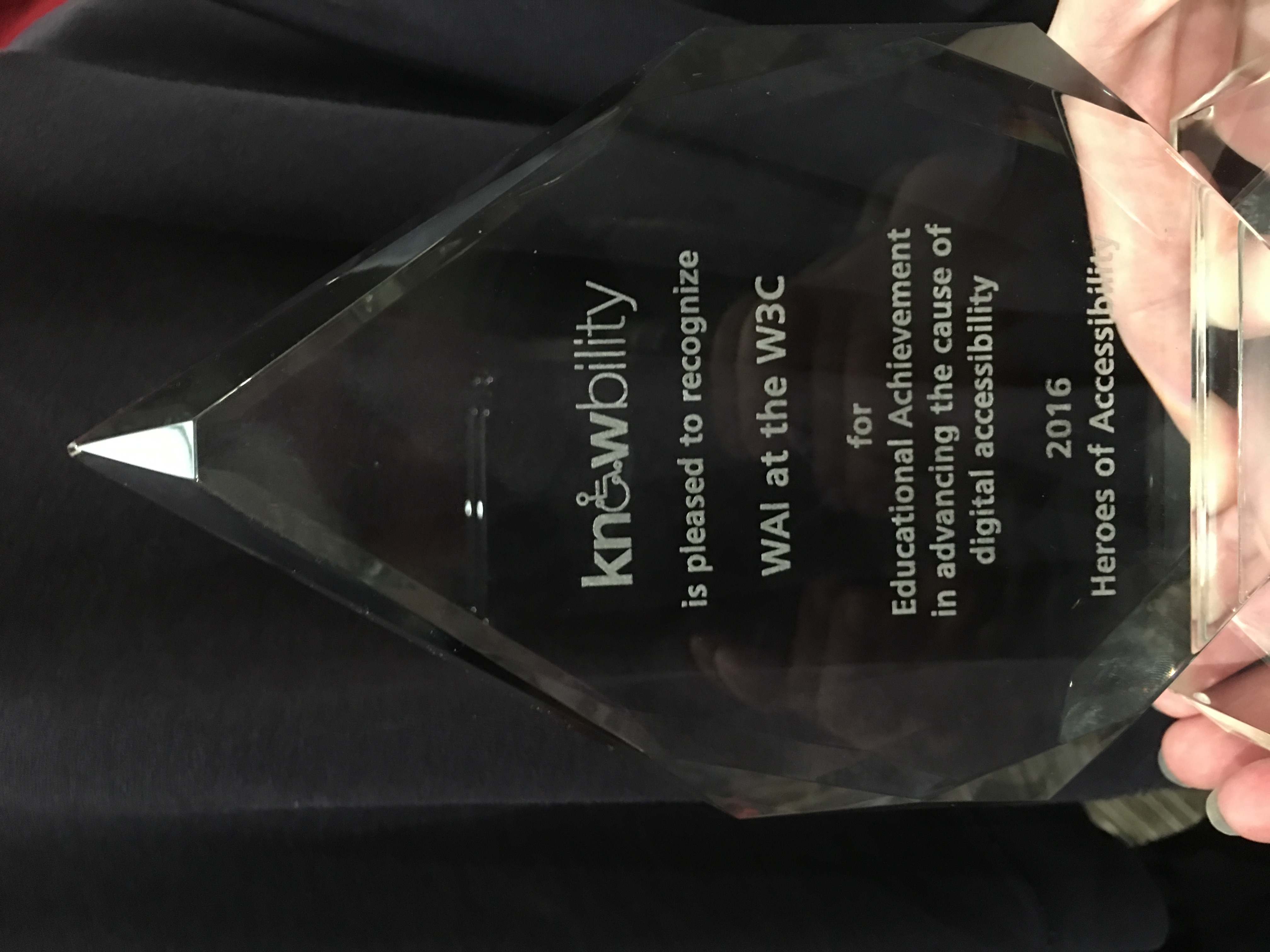 Shawn: There are two items that need to be recognized. At CSUN WAI was awarded the Heroes of Accessibility for Acheivement in Education. The awards are curated by Knowbility and this onw was for the educational work done by this group so I wanted to share that.