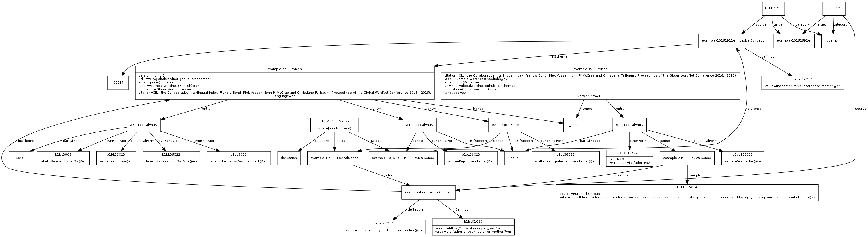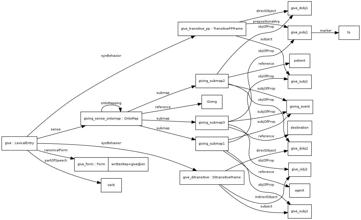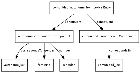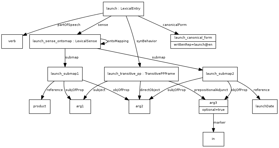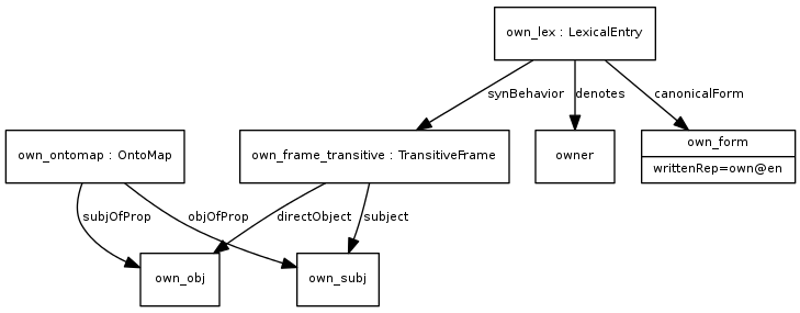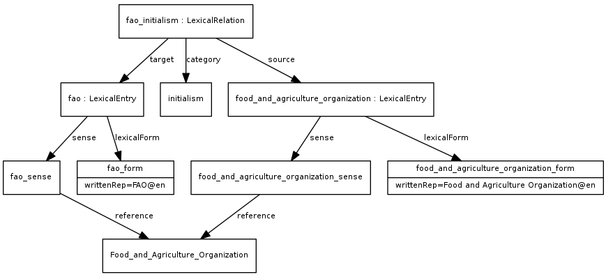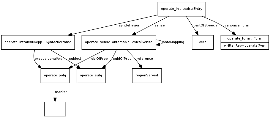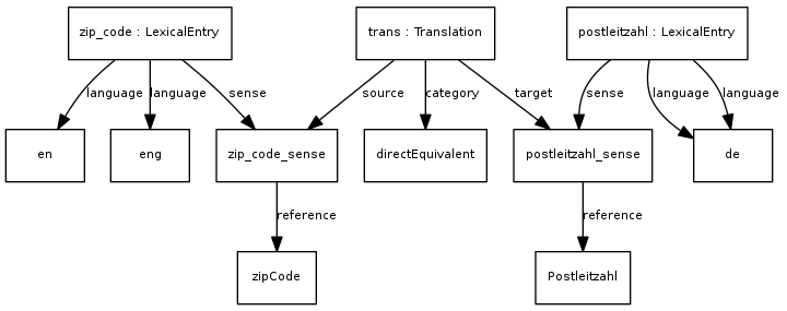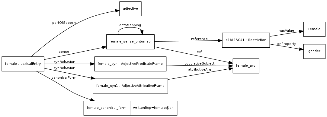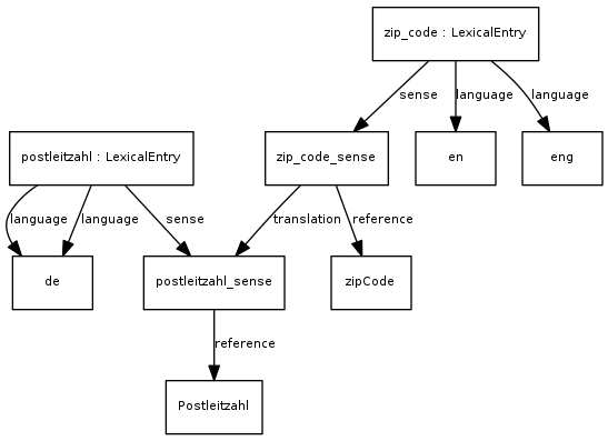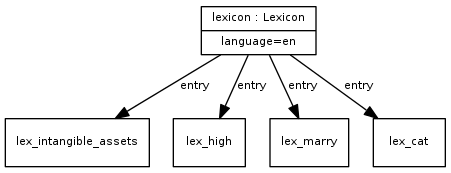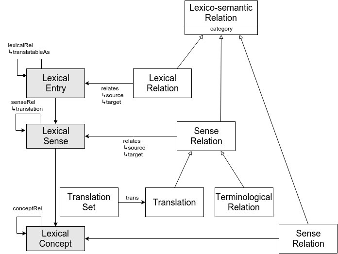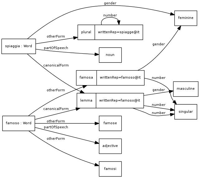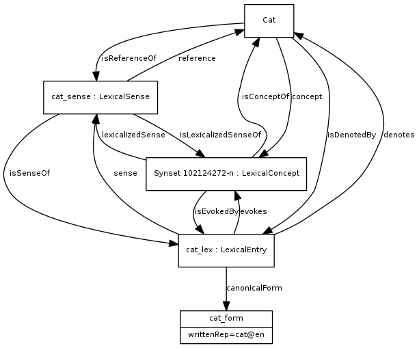 In many examples we will use the LexInfo ontology to describe grammatical categories, although this is not required for using this model. The LexInfo model and guidelines for constructing and extending linguistic category schemes are provided in the section on linguistic description.