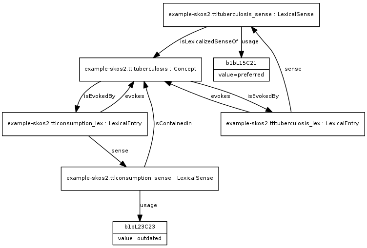 Nevertheless, SKOS and lemon can be used in conjunction to provide more detailed information about the "labels". We recommend to use the property evokes and its inverse isEvokedBy to relate a skos:Concept to a lexical entry. This is shown in the following example: