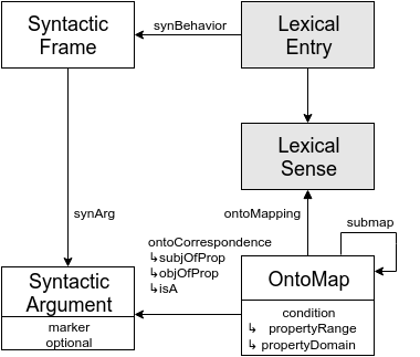 The model follows the principle of semantics by reference [1] in the sense that the semantics of a lexical entry is expressed by reference to an individual, class or property defined in the ontology. In some cases, the lexicon itself can add named concepts which are not made explicit in the ontology.