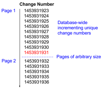 In this example, afterChangeNumber=1453931931 would return Page 2 labelled in Fig. 3 Illustration of the deterministic list via change number, hence the last item of a returned page of results can be used to get parameters to retrieve the next page of results, and thus the last item can be used to generate the "next page URL".