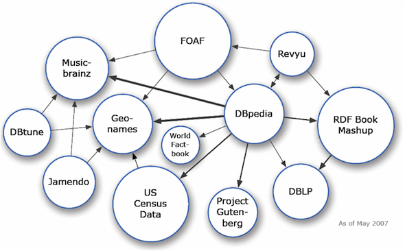 The Web of Data has been growing steadily. One measure of this is the Linked Open Data Cloud diagram. Here is the May 2007 version: