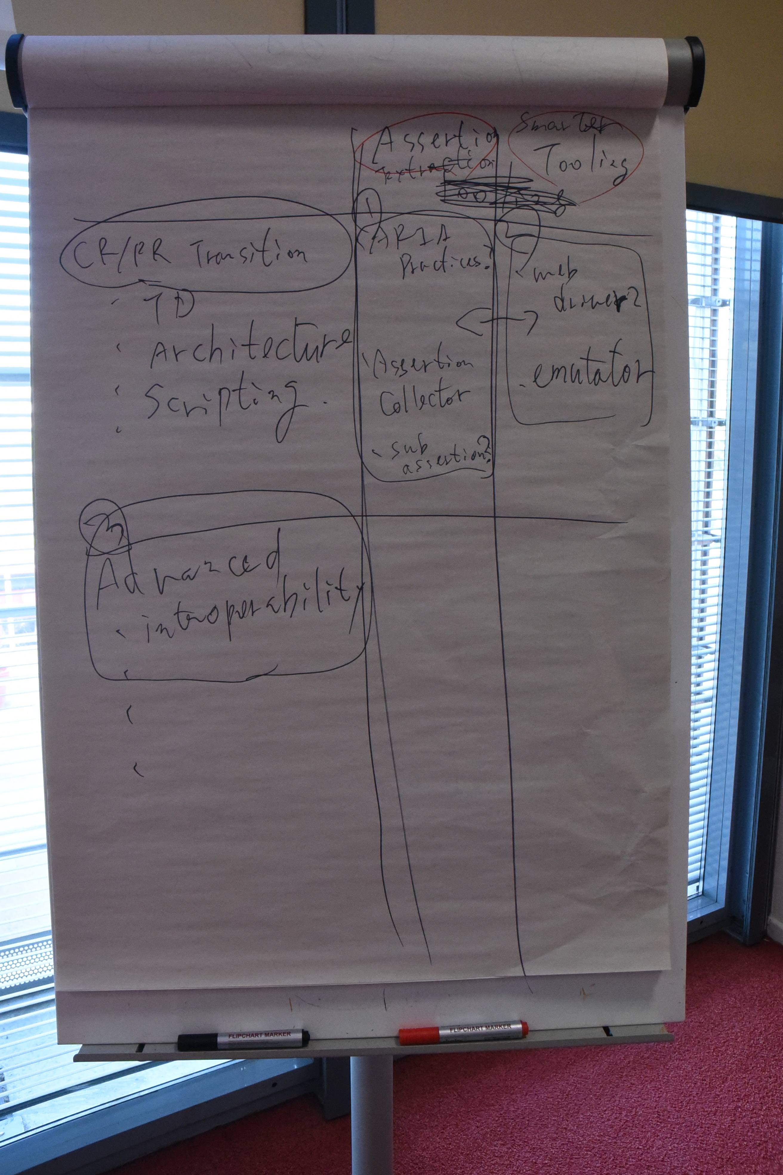 <inserted> (Regarding the expected "Testing" session tomorrow, Kaz mentions that he'll provide information on the basic framework (what to do for CR/PR transition). also he has invited Mike Smith from W3C Team who works on the W3C Testing Platform. McCool will update the agenda for tomorrow)