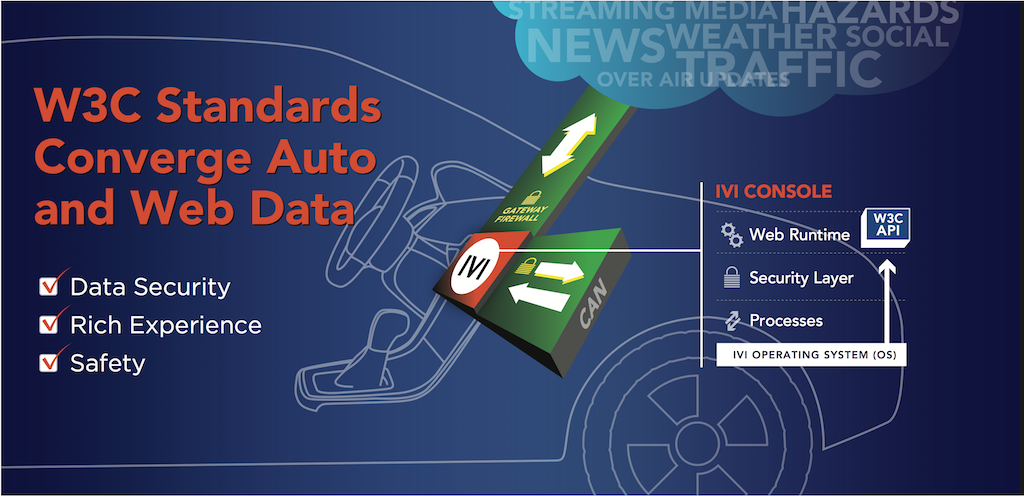 W3C 汽车工作组正在编写一个汽车服务规范,以定 义一个接口显示一系列汽车机械信号(引擎温度,汽油/电力量度,航程,轮胎压力,速度,等等),从而为汽车及相关设备创造一个丰 富的应用生态,彼此互联互通。