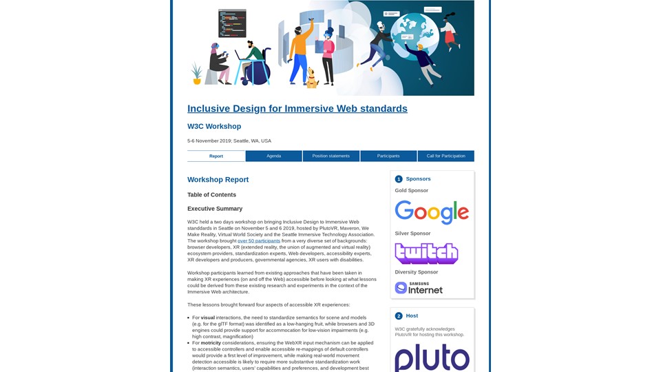 Together, this group addressed challenges that they identified and found four tracks of further consideration in the visual, motor, auditory, and assistive technologies. They identified as key need, the coordination of needs and standards technology development, formed an Inclusive XR Community Group to help facilitate that coordination.