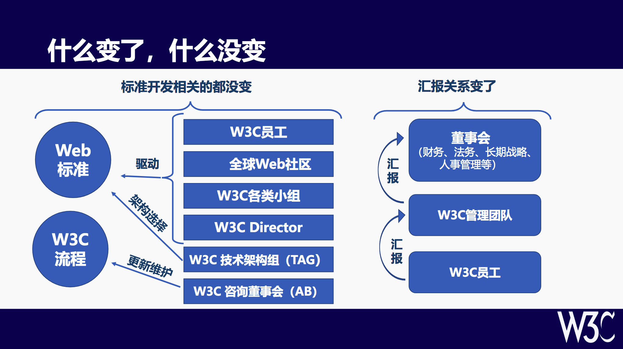 这张大图向大家展示了目前 W3C 的治理现状,每个总部机构(即 host)会派一位代表,加上我们的 CEO 成为 W3C 最高决策机构,他们共同决策 W3C 的日常运营。