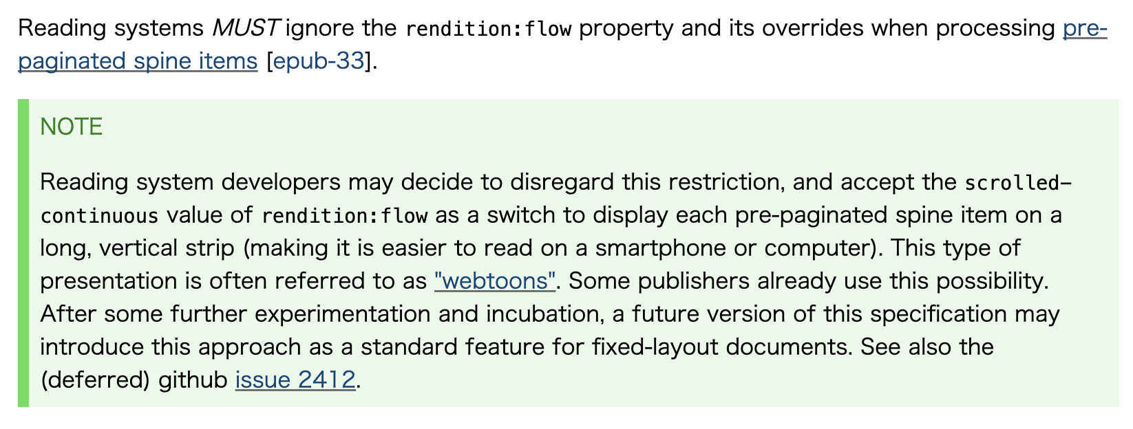 - Permit to use "rendition:flow-scrolled-continuous" in FXL for Webtoons and update EPUB spec as a class-3 change.