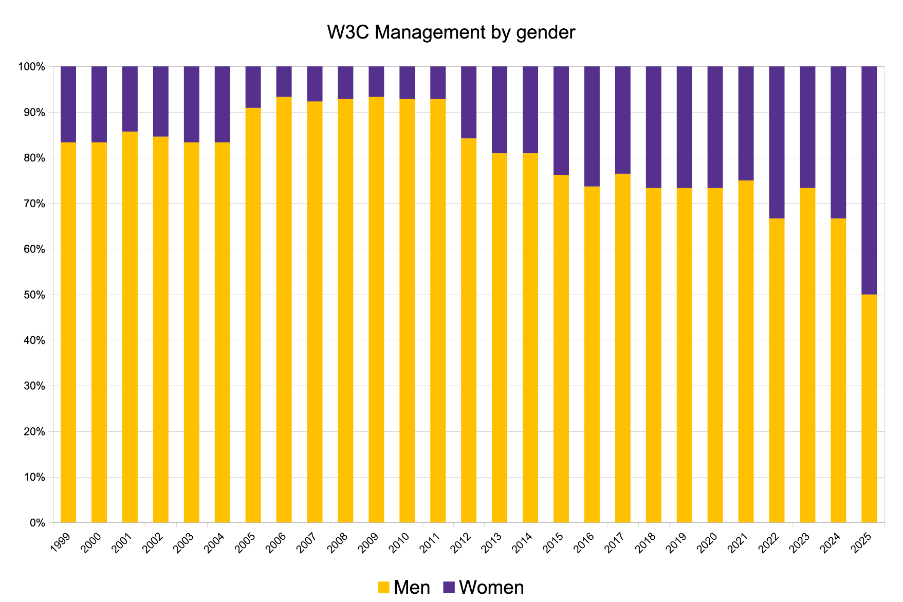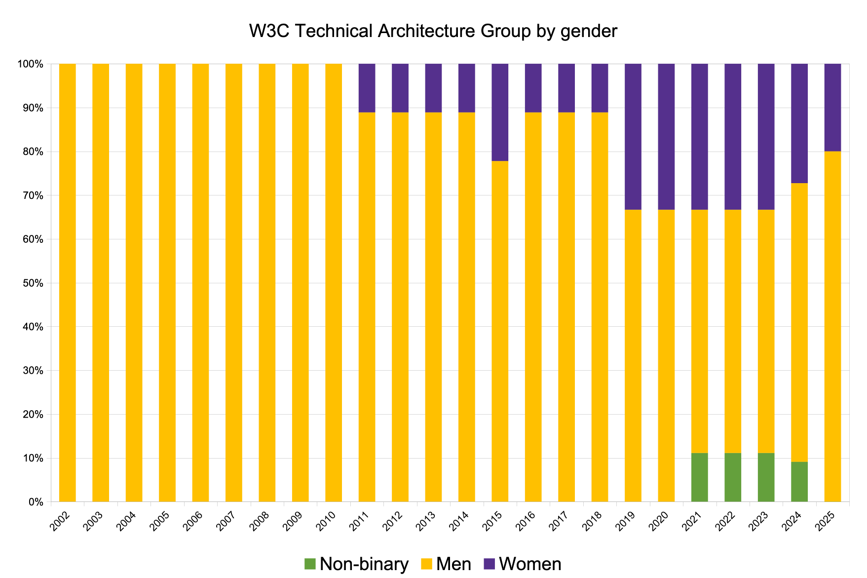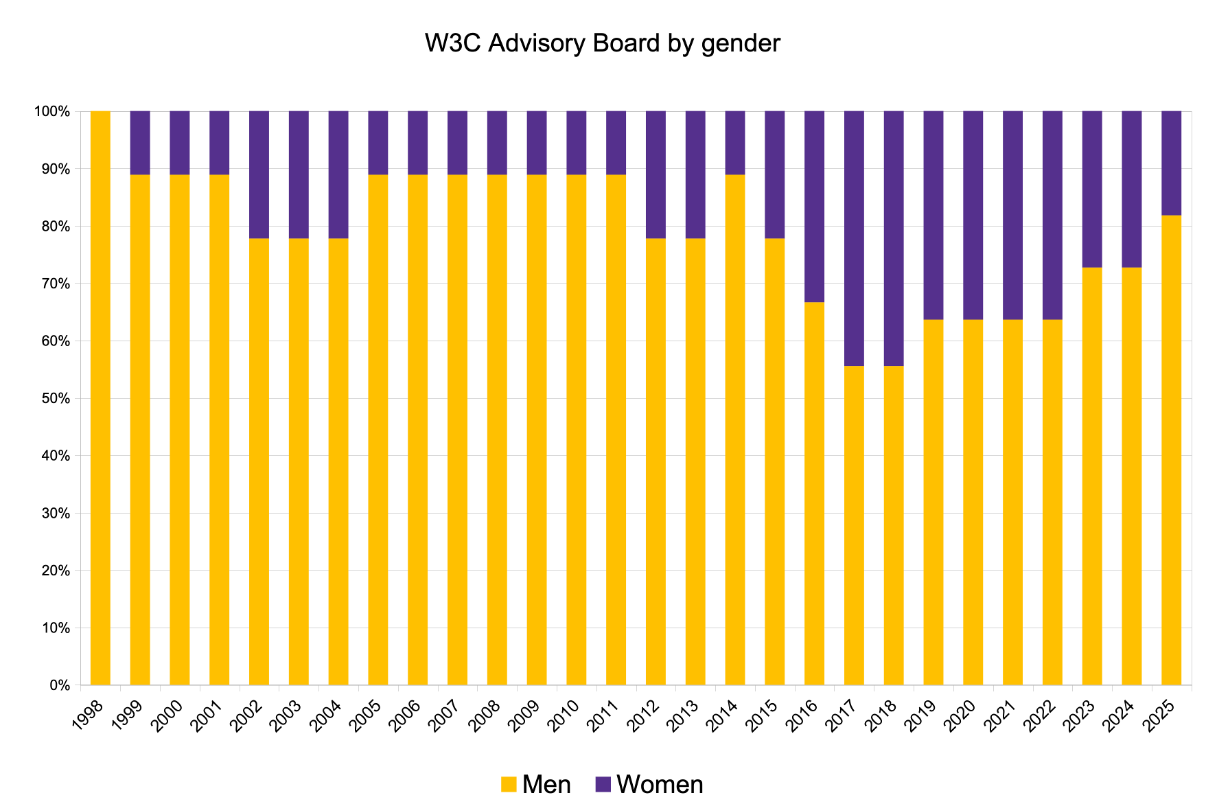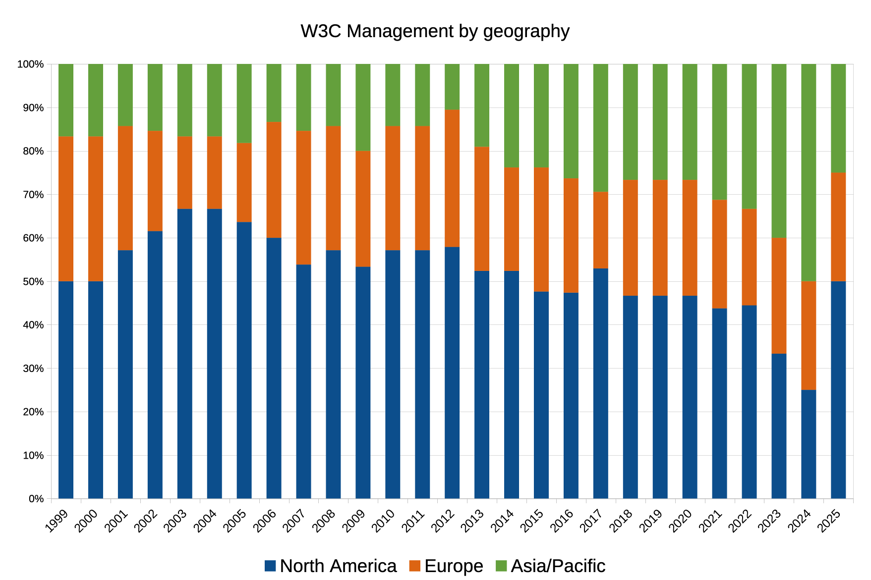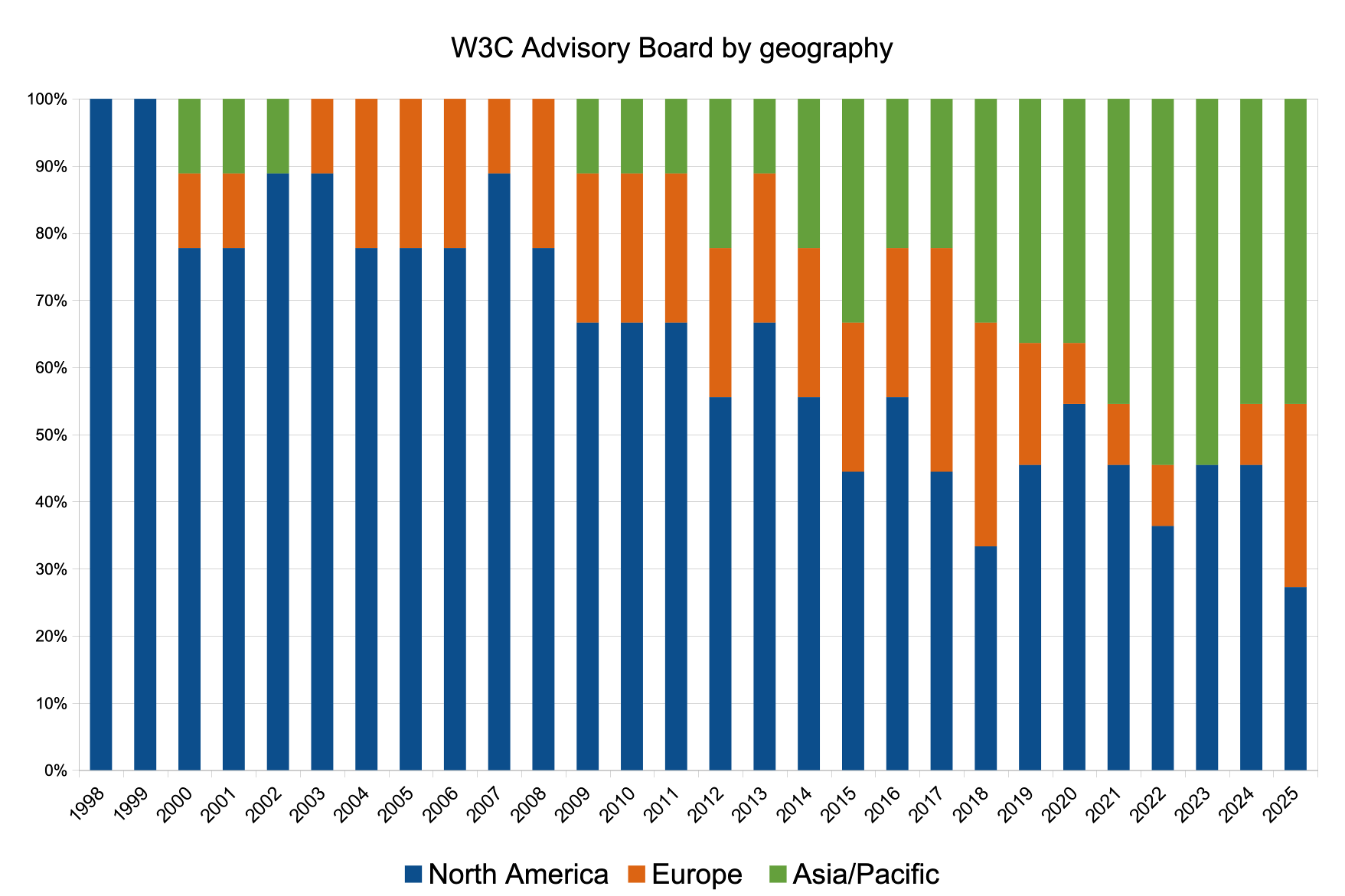 This is the long description of the graphs in the 2025 report representing gender and geography of several of W3C's governance bodies: W3C Advisory Board (AB), W3C Technical Architecture Group (TAG), W3C Board of Directors (BoD), and W3C Management (W3M).