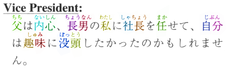 > What data do we have on this? The fact that most Japanese words are compound words with that structure? Level 1 markup only applies to a) single-kanji words--which are reasonably common but not overwhelmingly so b) multi-kanji words whose pronunciation cannot be broken down (which are very noticeably a small minority of such words) > All the examples I've seen of complex ruby have seemed rather contrived. The term "complex ruby" covers a lot of things and is imho a misleading distinction. Let's use instead the levels I outlined in my writeup. To which level(s) do the contrived examples you have seen belong and why do they seem contrived?