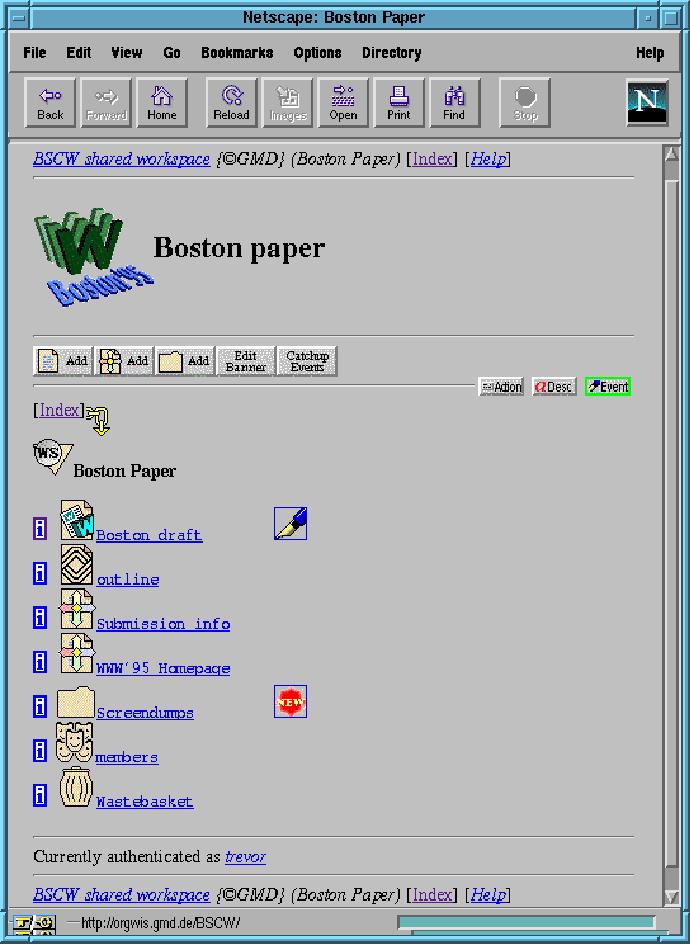 In Figure 1, the member 'trevor' has selected the event-view of the root-folder of the 'Boston paper' workspace. He sees the workspace objects in this folder--in this case, a FrameMaker and a Microsoft Word document, two links to related W3 pages, a sub-folder, the 'members' group and the workspace Wastebasket. To the right of each object, one or more icons may be displayed which signal that events have occurred concerning that object. So in Figure 1, the document 'Boston draft' has been written, while the 'Screendumps' folder has been added to the workspace since 'trevor' last logged in. Other events signalled in this way include 'read', 're-named', 'moved', 'versioned', while a 'deleted' event is signalled by the Wastebasket object becoming 'full', as in Figure 1. Members can cli ck on the event icon to get more information (such as who caused it and when it occurred), and can 'catch-up' events, similar to catching up read articles in a Usenet newsgroup, by clicking the 'Catchup events' button above the workspace listing.