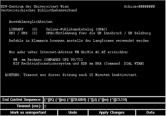 Another problem concerns page oriented interfaces. The end of a page has to be detected before the analysis process can start. In telnet based services transmission of characters usually just stops at the end of page. While this is obvious to the human client, it is not for an automated one. In order to avoid painful time-outs the character stream must be analyzed to identify discriminating character sequences which give a clue to an end-of-page. Sometimes heuristics have to be applied here too.