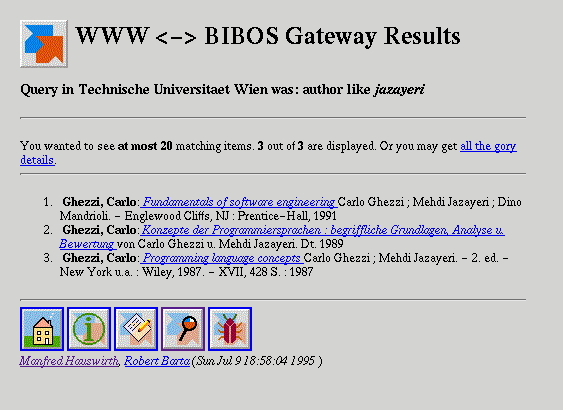 Finally we had to cope with a couple of special cases the existing BIBOS interface exhibits. So, for instance, a query process works slightly different when searching in all libraries at once rather than in a single one. Also BIBOS returns detailed information instead of compact references when only one match is found for a query. These non-orthogonalities do not make sense in a WWW context, so the gateway hides them from the user.