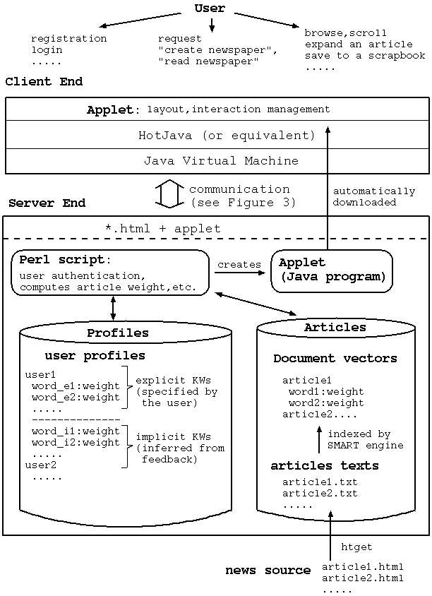 A set of server end programs fetch each day's articles, translate them into plain text, index them using SMART, and help users register and log on. This is implemented using cgi-scripts written in Perl. Code size of the script to maintain the database and create newspaper is about 500 lines, and the one to handle the login sequence, create new accounts and interact with the user is about 2000 lines. A set of client end programs manage the layout of the newspaper and user interaction. They are written in Java Release 1.0 Alpha3. Code size is about 3000 lines.