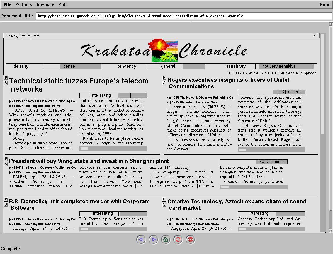 Figure 4 shows a typical screen of The Krakatoa Chronicle. It is the first web newspaper to attempt a realistic rendering of a newspaper with a multi-column format to resemble actual newspapers, and utilize embedded widgets for convenient browsing. The newspaper is divided into a set of pages, with articles of greater importance appearing earlier in the sequence. A page-scrollbar is available for browsing at the page level. Each page is divided into a set of article widgets, separated by 'bars' which can be dragged. An article widget holds the contents of an article and supports various browsing techniques.