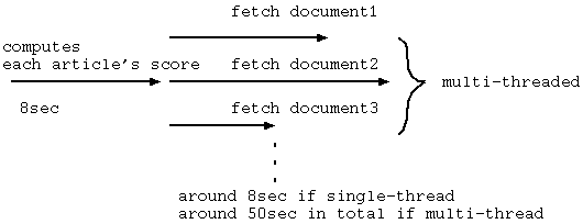 We get about 100 articles a day, and the size of each article ranges from 10-200 Kbytes without images. The batch process to index all the articles takes about half an hour and requires the system to be shut down, and is done at a time when demand is low. On a Sun SPARCstation 10 on our Ethernet LAN environment, it takes about 8 seconds to compute each article's score, and approximately 8 seconds to retrieve an article from the server to the client as a single-threaded process. On an initial visit to a newspaper page with six articles, about fifty seconds are required to compute the newspaper, bring it over and display the entire page's contents (see Figure 8).