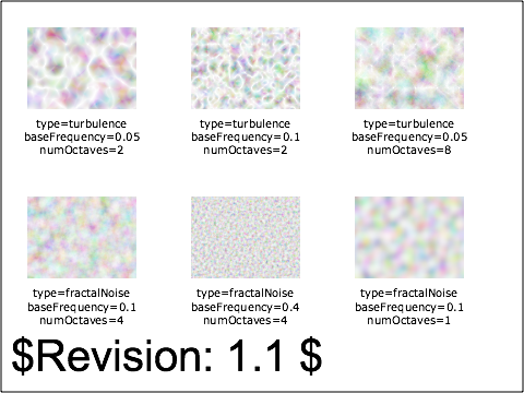 Test which verifies the basic facilities of feTurbulence. Six rectangular areas showing the effects of various parameter settings for feTurbulence. The sample image indicates the parameter settings to produce the given image.