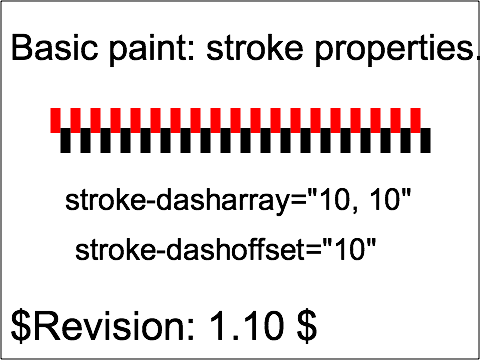 Verify the "stroke-dasharray" and "stroke-dashoffset" properties. Two lines are drawn, one red and one black. Both have a "stroke-dasharray" of "10,10" giving a dashed appearance where the size of the gaps and the size of the dash is equal. The help show this, the black line has a "stroke-dashoffset" so that the dashes in the black line match up with the gaps in the red line.
