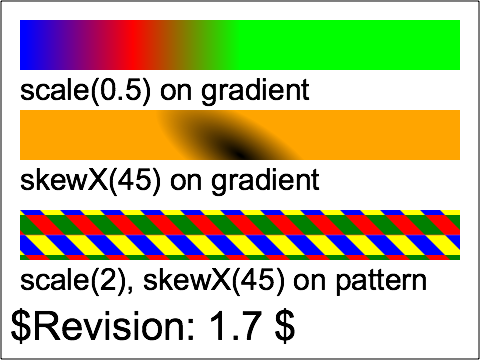 The last row contains a rectangle with pattern on the fill. The transformation on the pattern moves the coordinate system to the top left of the rectangle and then scales it by a factor of 2 and then skew's it in the X direction by 45 degrees. The pattern consists of a 2 by 2 array of colored rectangles.