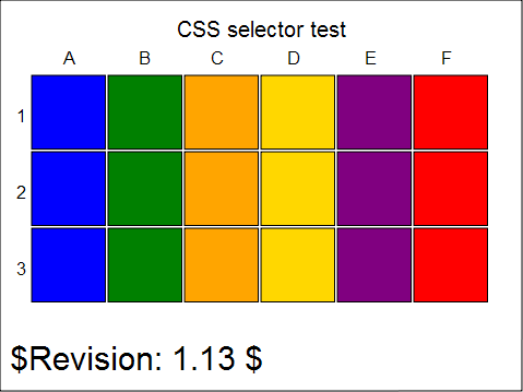 This tests a large number of selectors in combination. To pass this test, the CSS2 selectors and the specificity rules must be implemented exactly. The visual result is a 6 by 3 grid of colored rectangles; the columns of the grid are numbered A to F and the rows 1 to 3 for ease of reference. The correct rendering is shown in the following image: