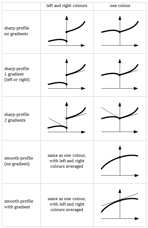 - may have any number of smoothly transitioning colours specified independently on the left and right hand sides of the curve