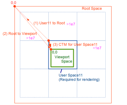 So, it is necessary for tiling to perform this coordinate transformation precisely. As this figure shows, both the matrix from user 11 to root and the matrix from root to viewport need long effective digits. However, the effective digits of CTM which is just needed for actual rendering is short. It is because user space 11 and viewport space are surely going near.