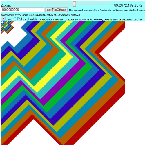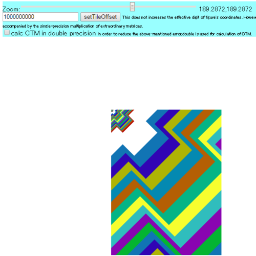If the number of the item setTileOffset is increased, the origin of a tile's user space toward root space will be shifted. (As a result, the required effective digit of viewBox (in root space) increases.) Provided that, viewport is still set up so that the origin of a tile may become an upper left corner of a screen by changing svg element's viewBox property. This is the coordinate transformation operation equivalent to this proposal.