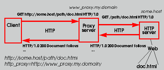 Figure 3. Client makes a request to the proxy server using HTTP, but specifying the full URL; the proxy server connects to the remote server and requests the resource relative to that server (no protocol or hostname specifier in the URL).