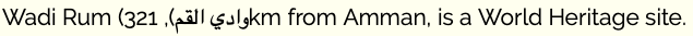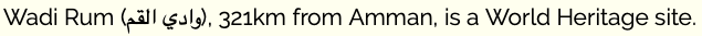 Wadi Rum < وادي القم >, 321km from Amman, is a World Heritage site.