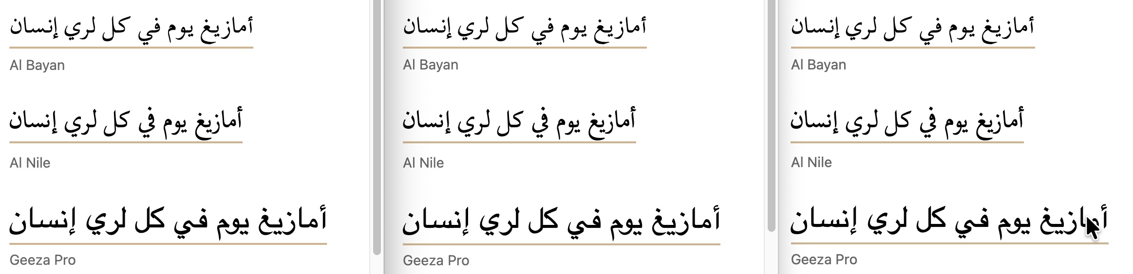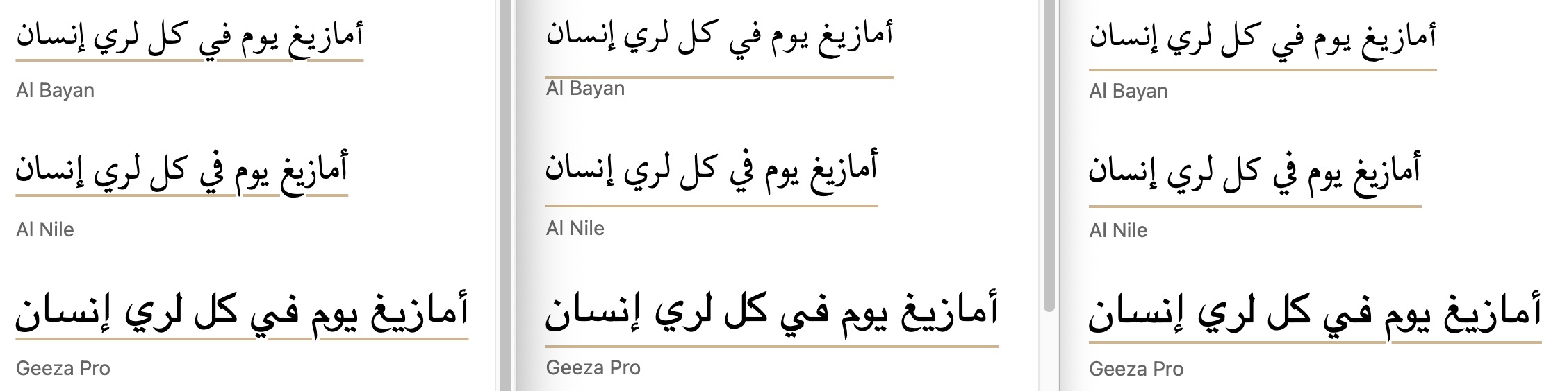 Arabic. A setting of 45% consistently cleared the longest descenders for the set of fonts without descenders. For the fonts with diacritics from Wolofal, Hausa, Pashto, and Kashmiri orthographies, the same result was achieved when the percentage was set to 75%. (No pre-installed fonts supported these diacritics, so the result for Safari is not shown.)