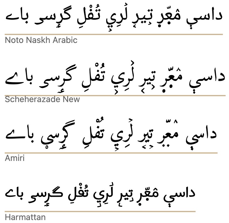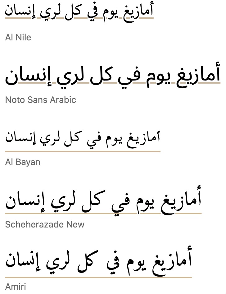 Arabic. Tests with 43 system, Noto, and SIL Arabic fonts found that only 11 moved the underline down when from-font was applied. Of those 11, only 7 actually cleared the descenders. Diacritics below the descenders are not usually present in Arabic and Persian language text, but they may occur for educational or clarification purposes, and there are certain orthographies using the Arabic script that always include all diacritics (such as African ajami texts). When diacritics appear below the descenders they are sometimes bisected by the underline.